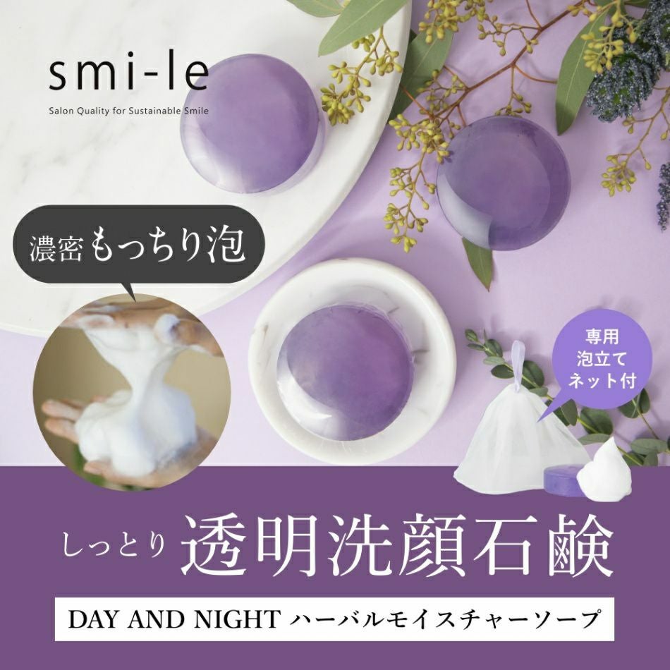 他の画像を見る 定期販売 【送料無料】[洗顔石鹸] smi-le DAY AND NIGHT ハーバルモイスチャーソープ 80g 1回あたり ¥ 1,500 税込 透明石鹸ならではの美しさと、きめ細やかな泡で洗い上げるしっとり洗顔石鹸 詳細を見る お気に入りに登録する