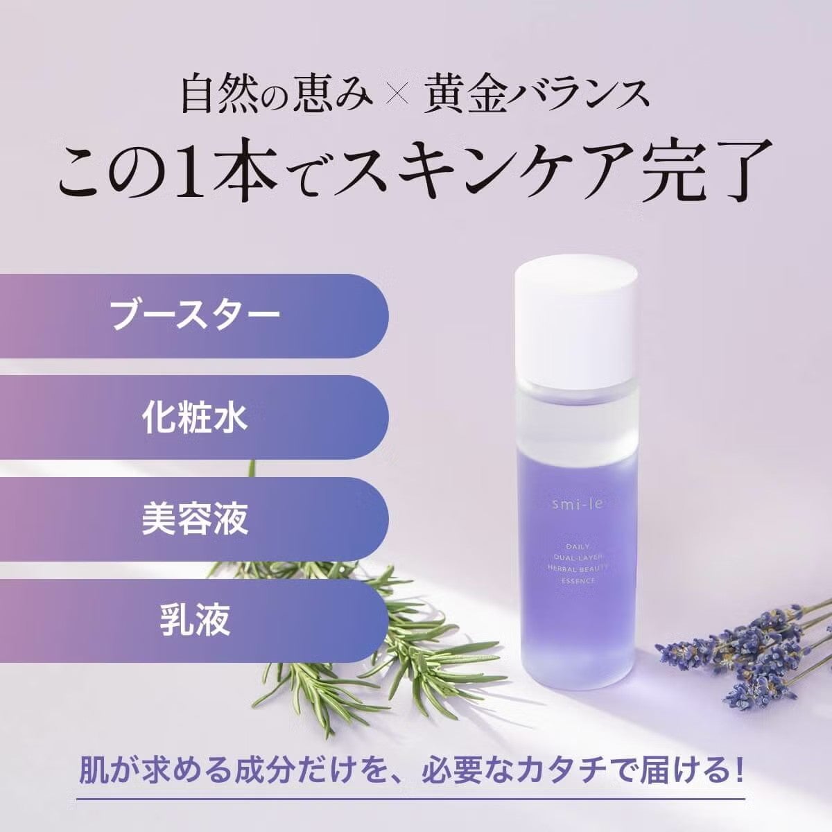 他の画像を見る 【実質1本無料&送料無料】[オールインワン化粧美容液] smi-le DAILY 2層式ハーバル化粧美容液 100ml ¥ 4,290 税込 1本実質無料!1本の価格でもう1本ついてくる!さらに送料無料!2/19(木)23:59まで 肌が本来必要とする水分と油分のバランスを考え、smi-le独自の8:2の黄金比で配合。 カートに入れる お気に入りに登録する