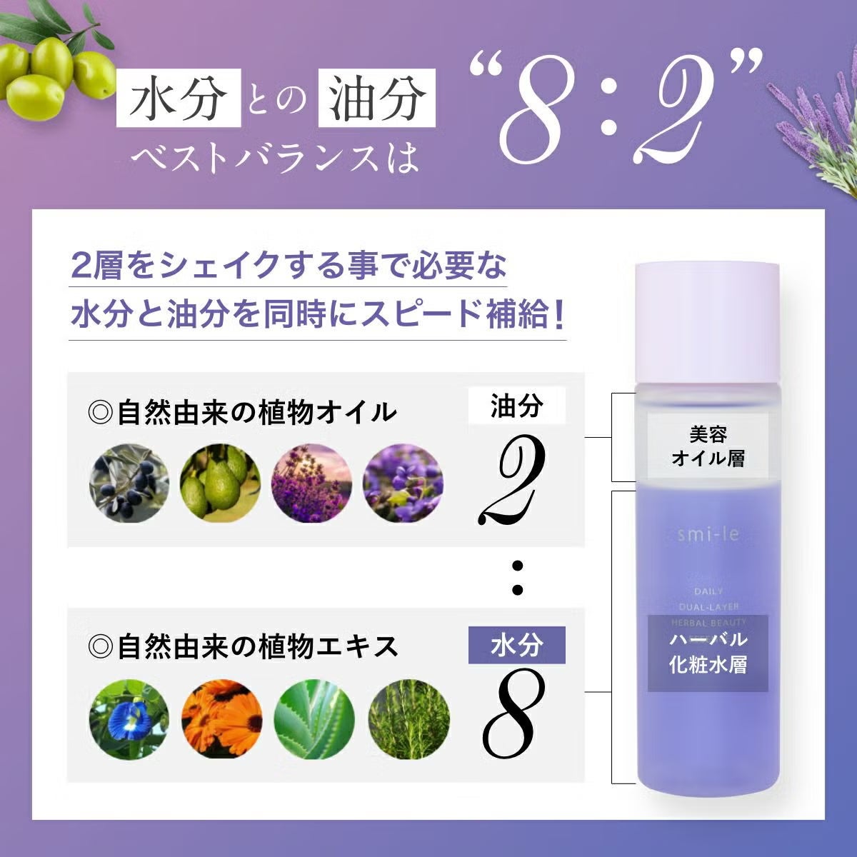 他の画像を見る 定期販売 【送料無料】[オールインワン化粧美容液] smi-le DAILY 2層式ハーバル化粧美容液 100ml 1回あたり ¥ 2,500 税込 肌が本来必要とする水分と油分のバランスを考え、smi-le独自の8:2の黄金比で配合。 詳細を見る お気に入りに登録する